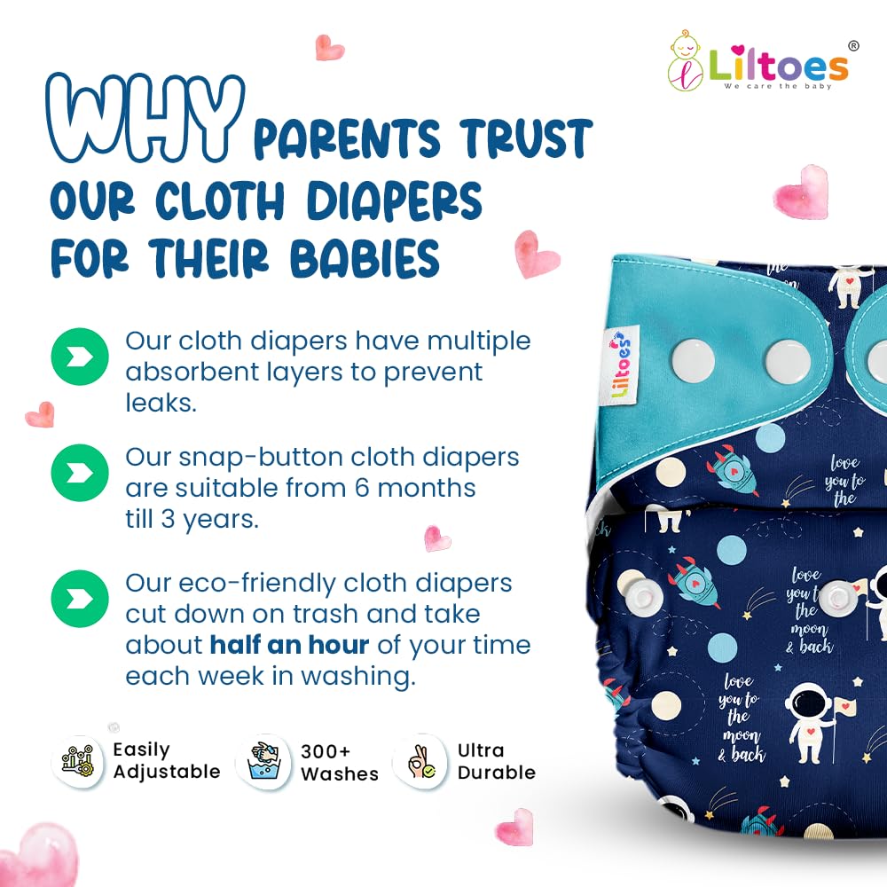 - All in One Adjustable: Liltoes Cloth Diaper has Smart Snap Buttons on the pocket to make it one size for all. You can Easily Adjust the size S, M and L of the Diaper. That is the reason Liltoes Cloth Diaper is so economical by using same diaper for a new born baby to potty trained Baby.