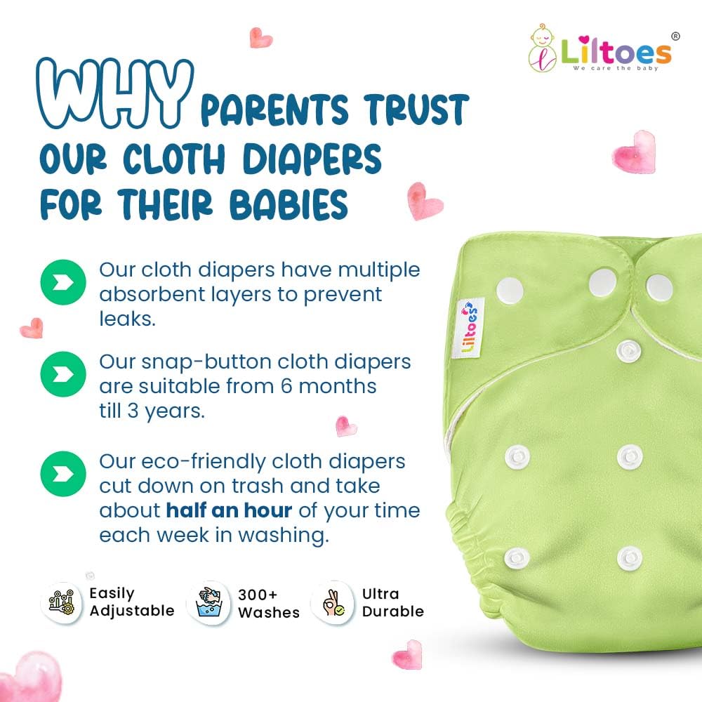 All in One Adjustable: Liltoes Cloth Diaper has Smart Snap Buttons on the pocket to make it one size for all. You can Easily Adjust the size S, M and L of the Diaper. That is the reason Liltoes Cloth Diaper is so economical by using same diaper for a new born baby to potty trained Baby. It contains 2 pieces of Cloth diaper & 4 pieces of Inserts. - Washable and Dryable: These diaper can easily be washable and dryable this makes it economical. It can be washable at least 300 times.