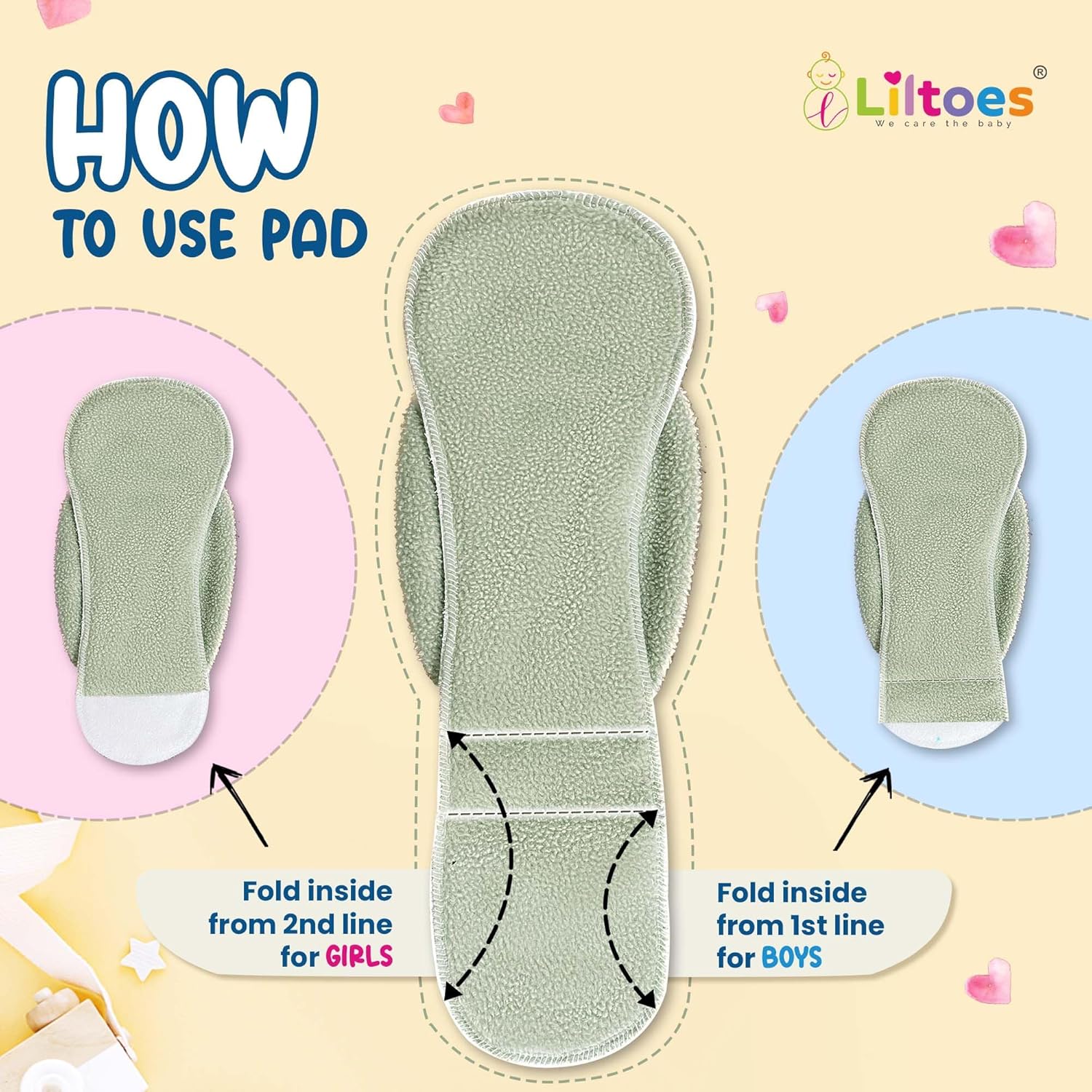 - Instruction Guide : 1. For Baby Girl fold the pad through the second line, as more absorbency is required at the back.