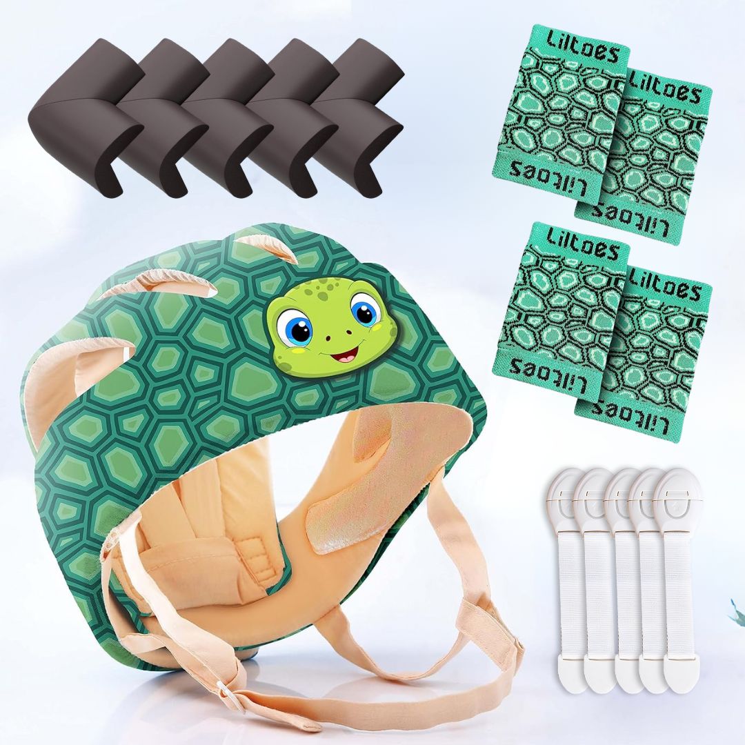 - Complete safety solution: Includes a baby safety helmet, corner guards, cabinet locks, and kneepads for comprehensive protection securing dangerous items.