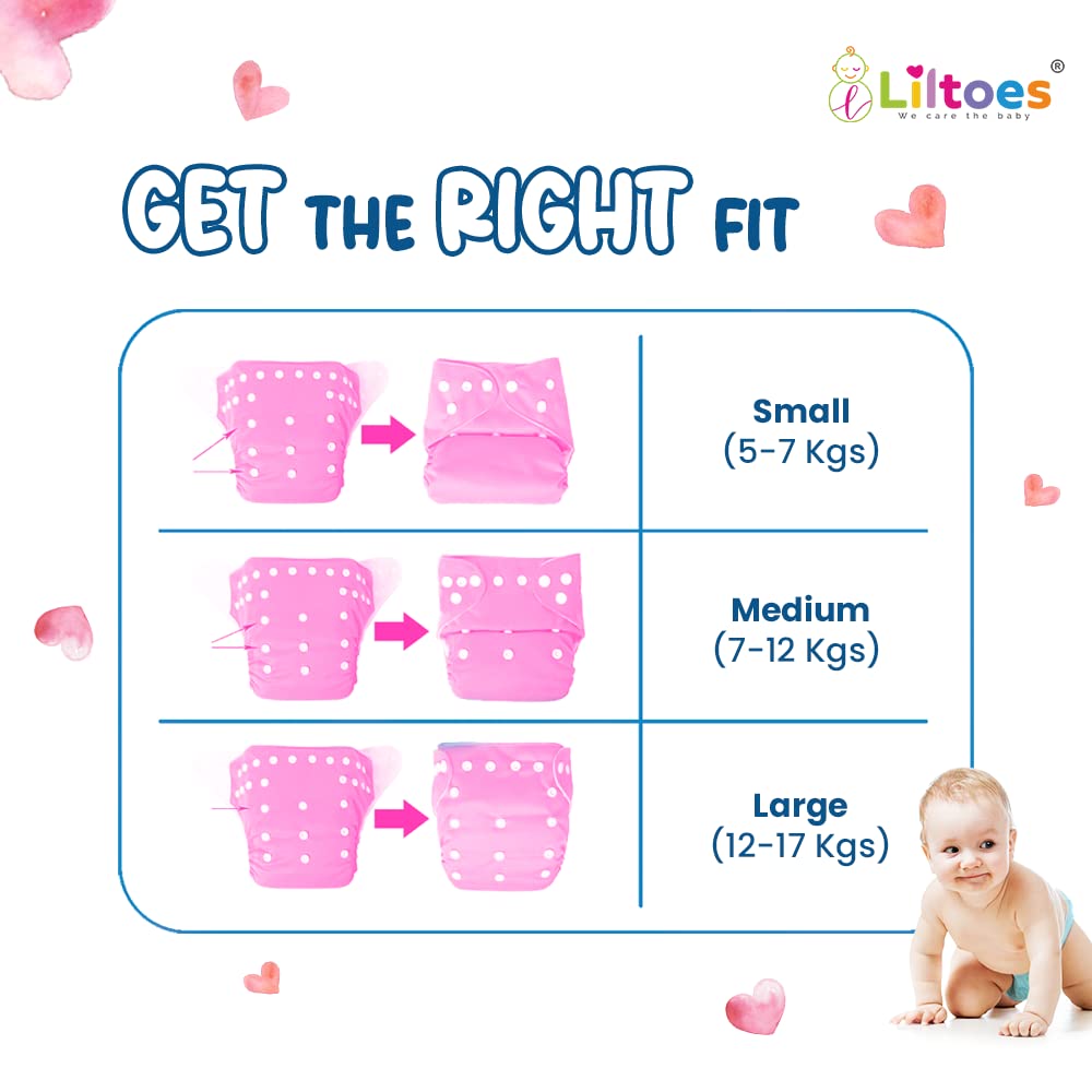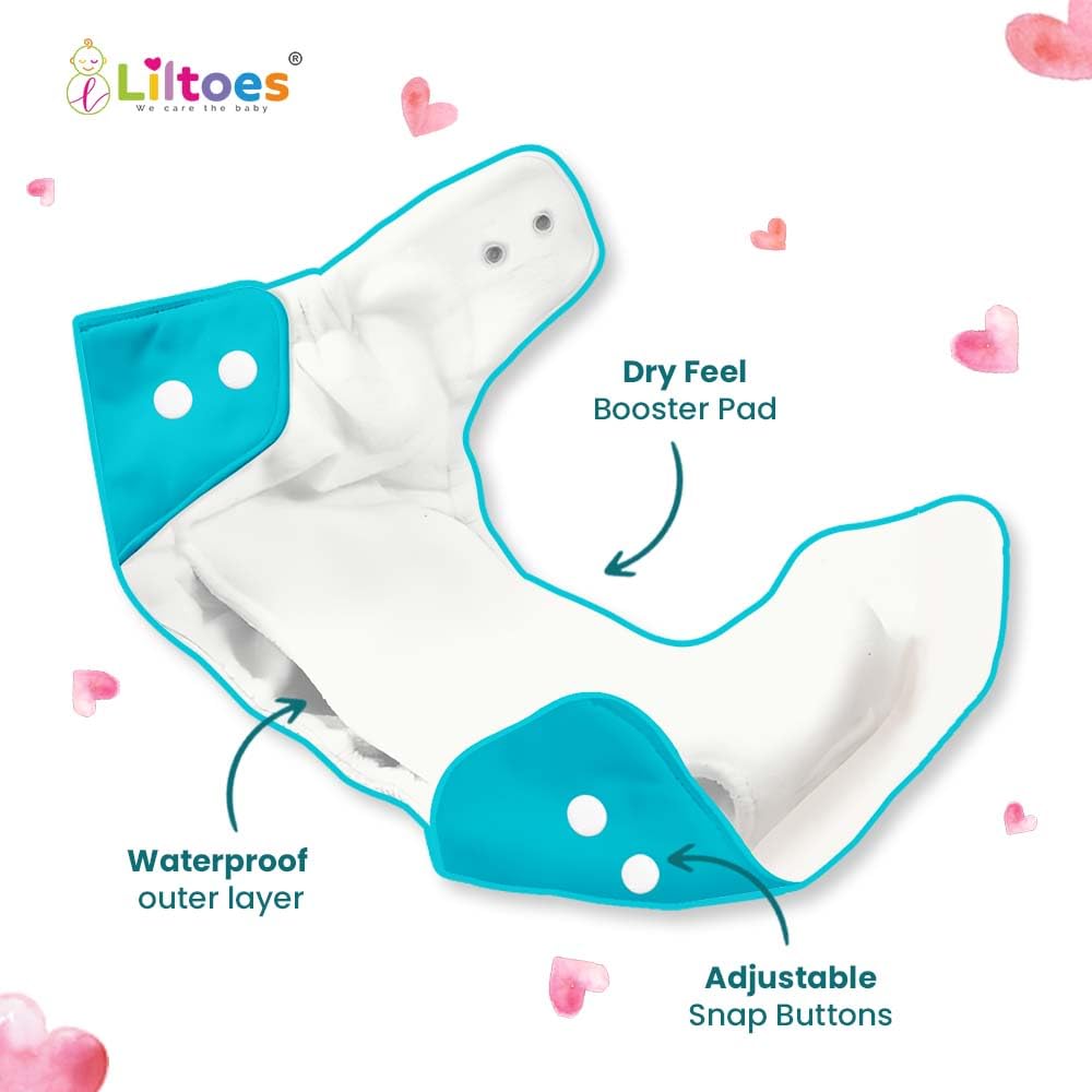 •  All in One Adjustable: Liltoes Cloth Diaper has Smart Snap Buttons on the pocket to make it one size for all. You can Easily Adjust the size S, M and L of the Diaper. That is the reason Liltoes Cloth Diaper is so economical by using same diaper for a new born baby to potty trained Baby.
