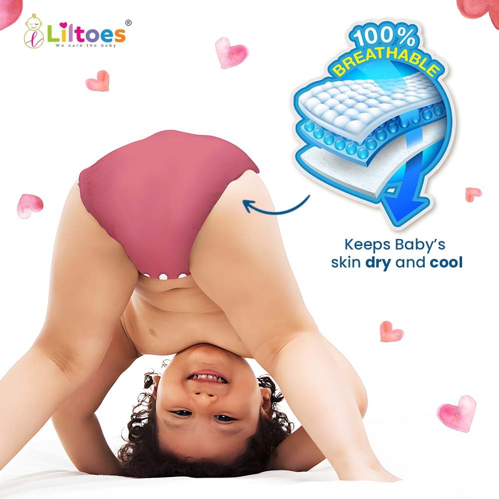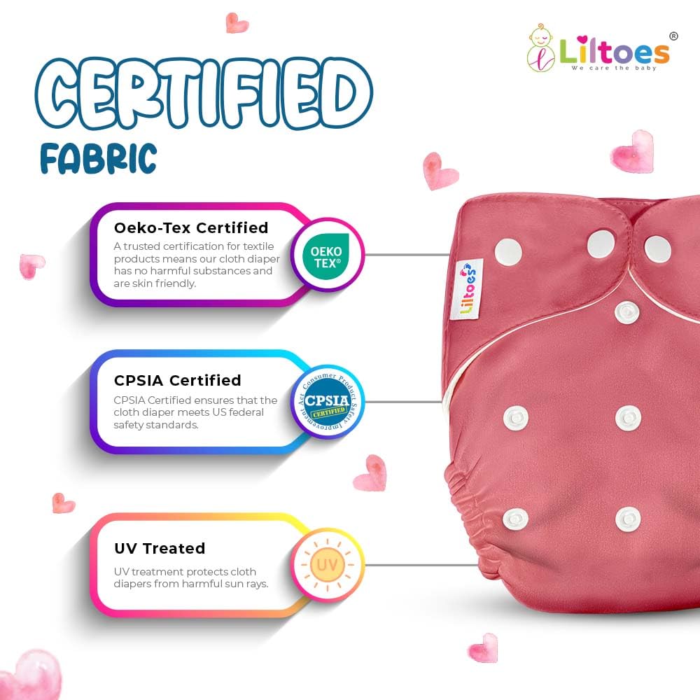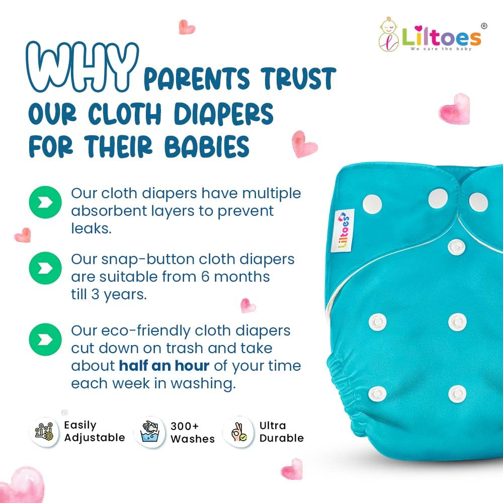 Liltoes Cloth Diapers are made with 100% soft, breathable cotton on the inner layer to keep your baby’s skin dry and rash-free. The outer layer is crafted from a waterproof yet breathable PUL (Polyurethane Laminate) fabric, preventing leaks while allowing air circulation. Our reusable inserts are made of high-absorbency microfiber or bamboo fleece, designed to lock in moisture effectively.
