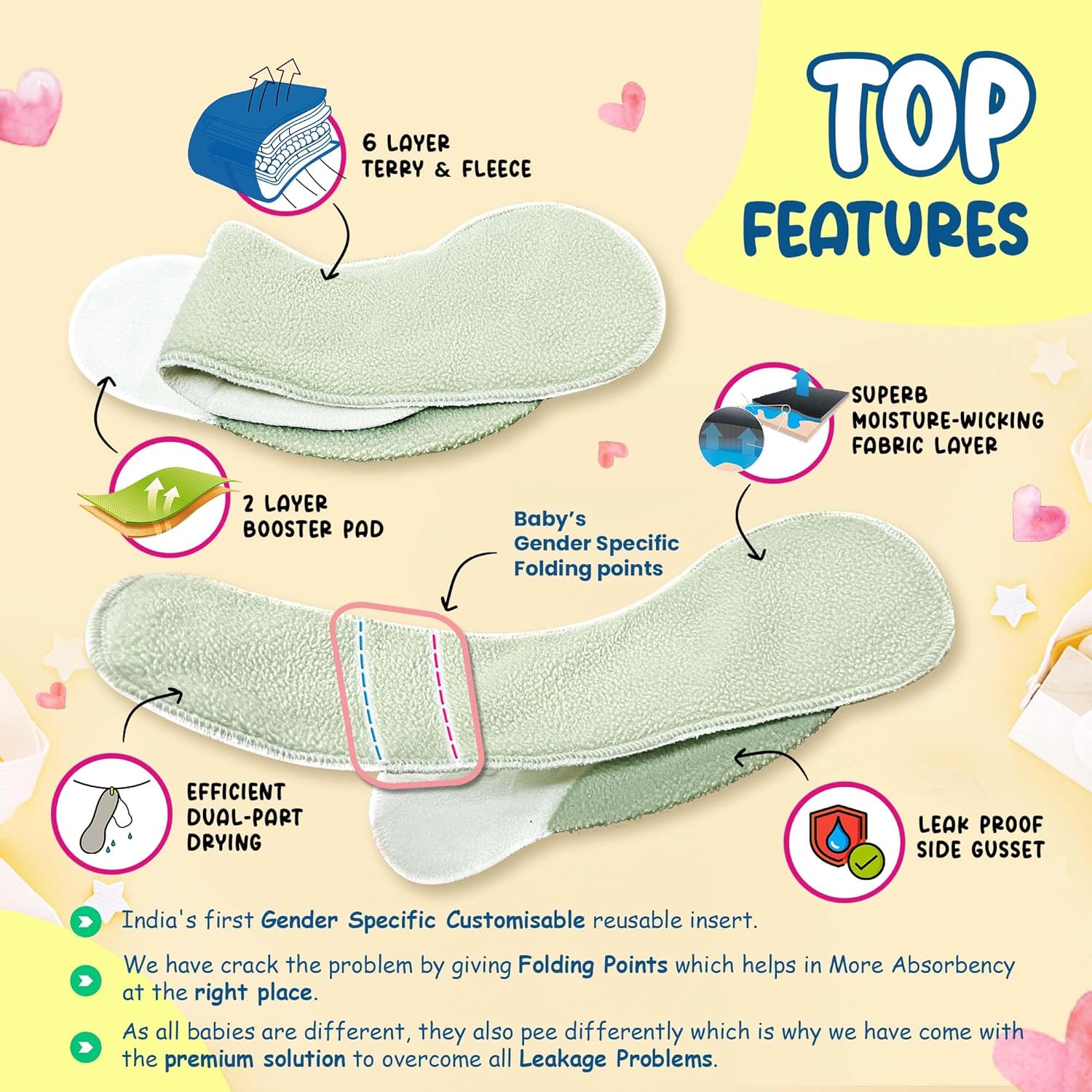 • Instruction Guide : 1. For Baby Girl fold the pad through the second line, as more absorbency is required at the back.